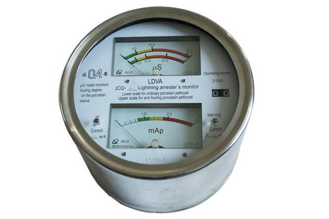 ??JSH-4型監(jiān)測器配有不銹鋼制作的屏蔽環(huán)及熱縮絕緣的引下線,瓷套外的漏電流通過監(jiān)測器瓷套的裙間金屬環(huán),導(dǎo)入內(nèi)中右側(cè)毫安表,毫安表中刻度是用反映污層電導(dǎo)率uS來表示的,它考慮了我國主要避雷器生產(chǎn)廠所用瓷套的爬電距離及絕緣子形狀因素。表的上層刻度適用普通瓷裙,下層刻度適用大小防污瓷裙。